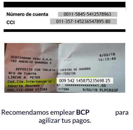 - Si eres BCP: Número de cuenta de 14 dígitos.